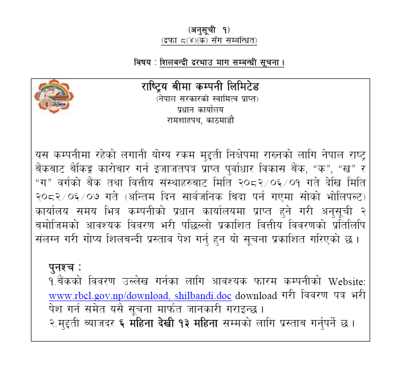 Rastriya Beema Company Limited is the only non-life insurance company owned by the Government of Nepal. For the past 55 years, the company has been providing various insurance services to various ministries and agencies of the Government of Nepal, public institutions, private business establishments and the general public with the objective of reducing financial risk and reducing foreign exchange...
